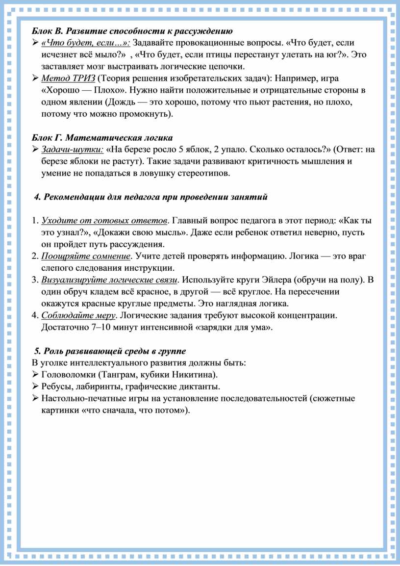 Ø Задачи-шутки: «На березе росло 5 яблок, 2 упало. Сколько осталось?» (Ответ: на березе яблоки не растут). Такие задачи развивают критичность мышления и умение не попадаться в ловушку стереотипов.