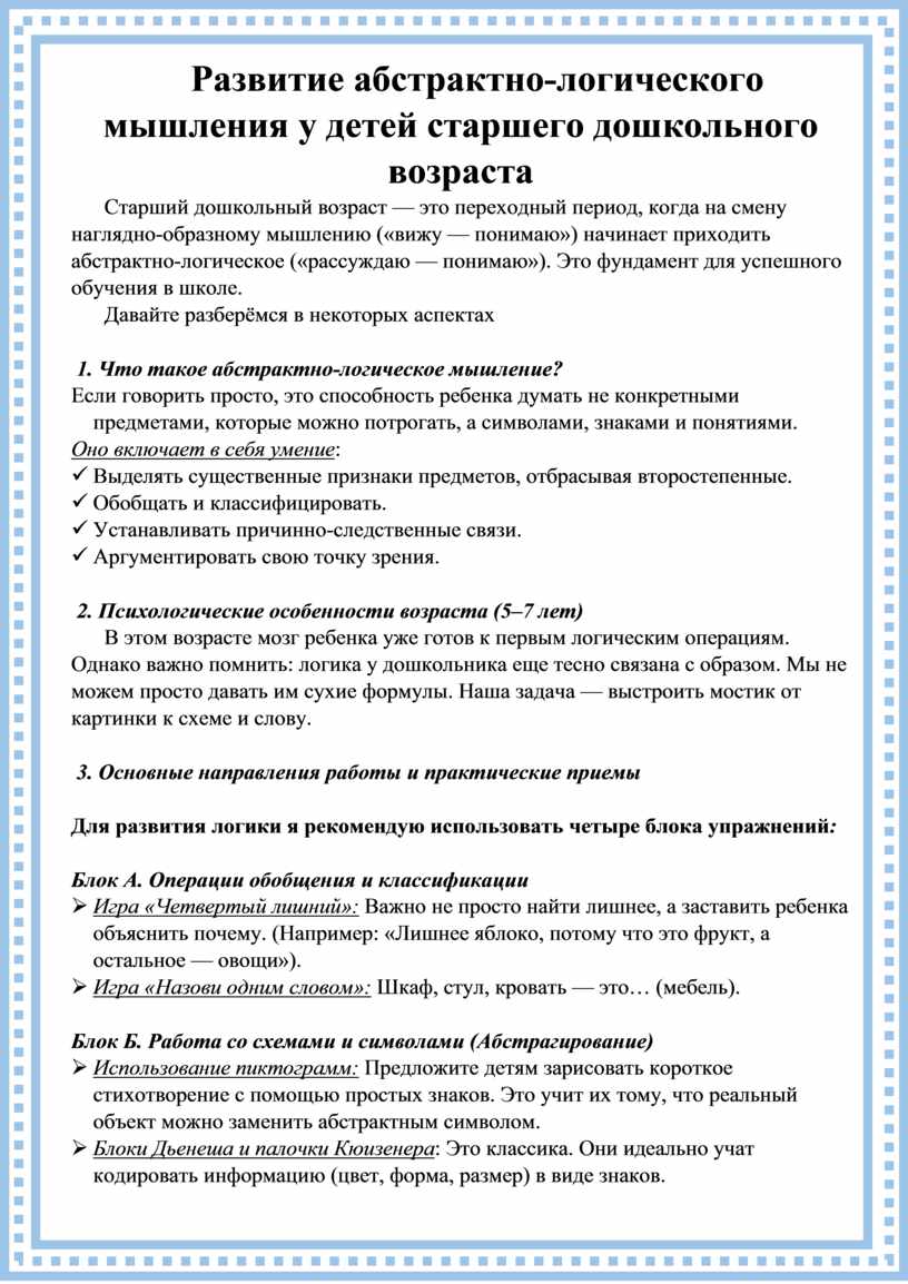 Старший дошкольный возраст — это переходный период, когда на смену наглядно-образному мышлению («вижу — понимаю») начинает приходить абстрактно-логическое («рассуждаю — понимаю»). Это фундамент для успешного обучения в школе.