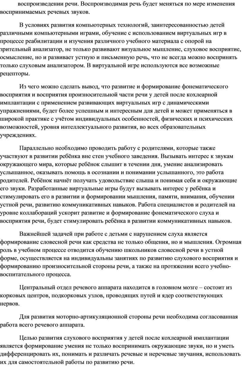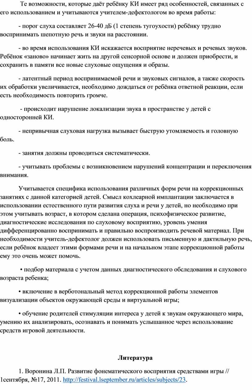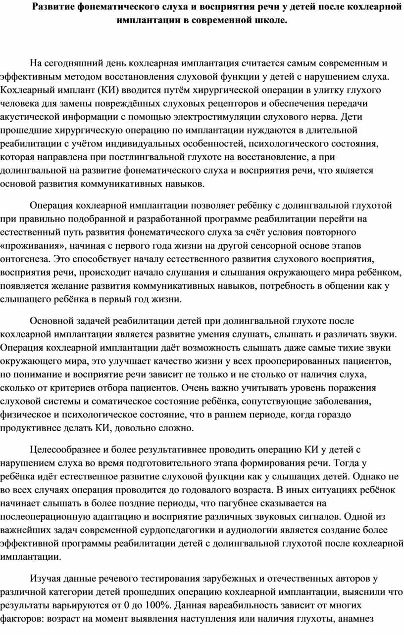 Развитие фонематического слуха и восприятия речи у детей после кохлеарной имплантации в современной школе.