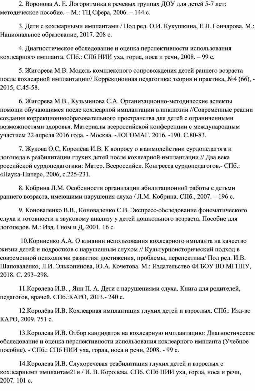 14.Королева И.В. Слухоречевая реабилитация глухих детей и взрослых с кохлеарными имплантам21и / И. В. Королева. СПб. СПб НИИ уха, горла, носа и речи, 2007. 101 с.
