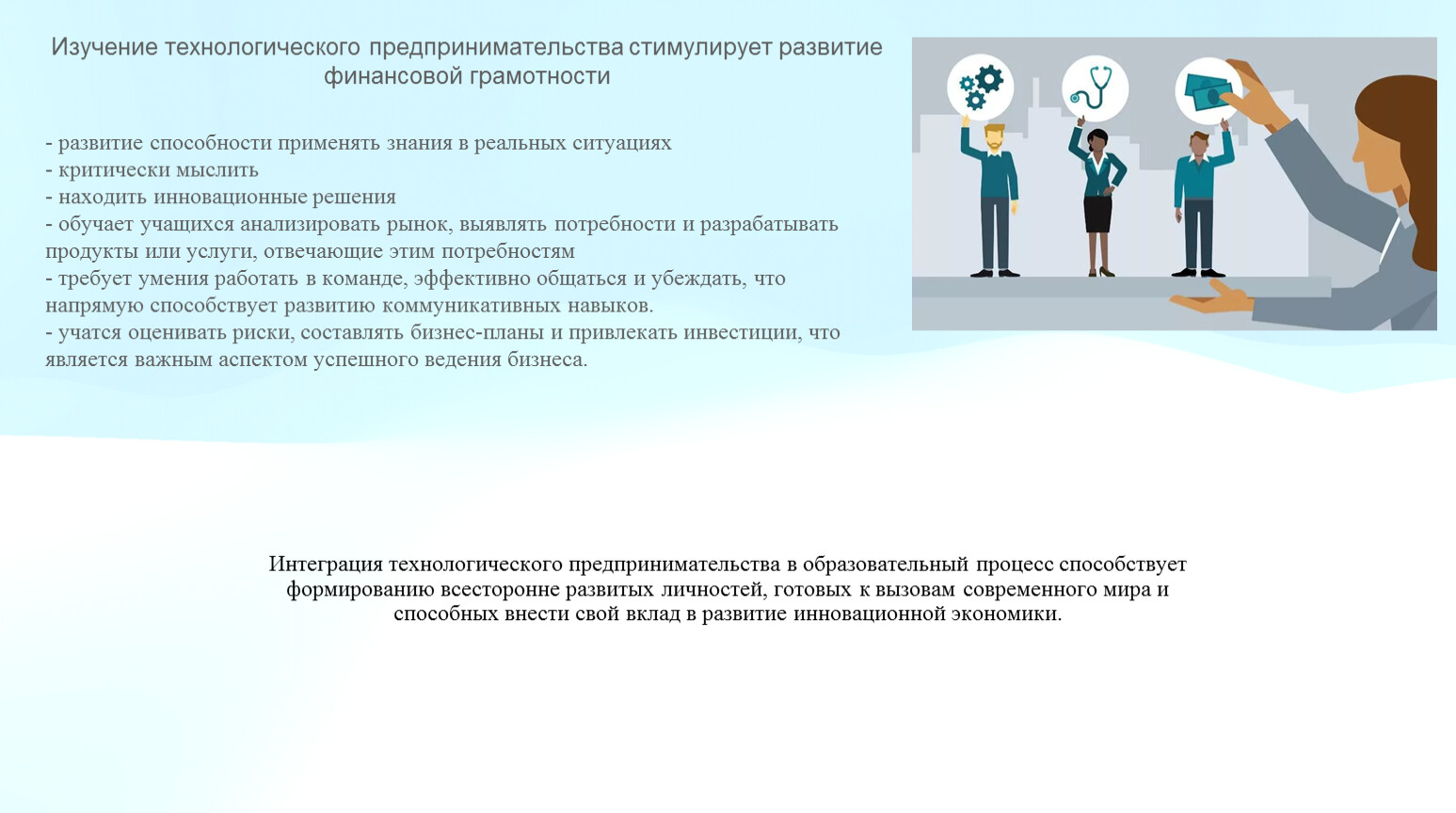Интеграция технологического предпринимательства в образовательный процесс способствует формированию всесторонне развитых личностей, готовых к вызовам современного мира и способных внести свой вклад в развитие инновационной экономики.