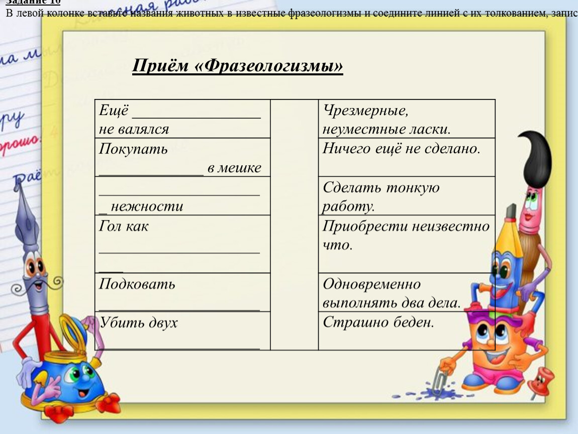 В левой колонке вставьте названия животных в известные фразеологизмы и соедините линией с их толкованием, записанным в правой колонке.