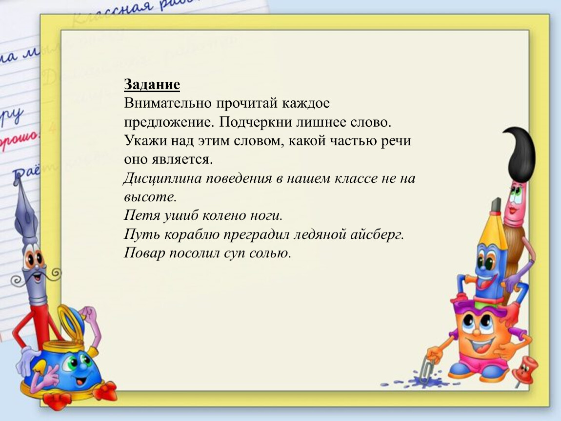 Внимательно прочитай каждое предложение. Подчеркни лишнее слово.