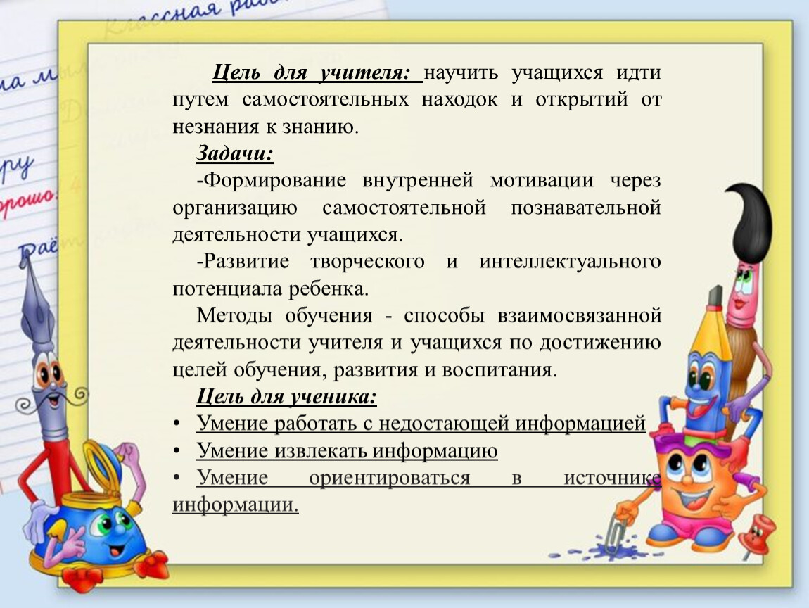 Цель для учителя: научить учащихся идти путем самостоятельных находок и открытий от незнания к знанию.