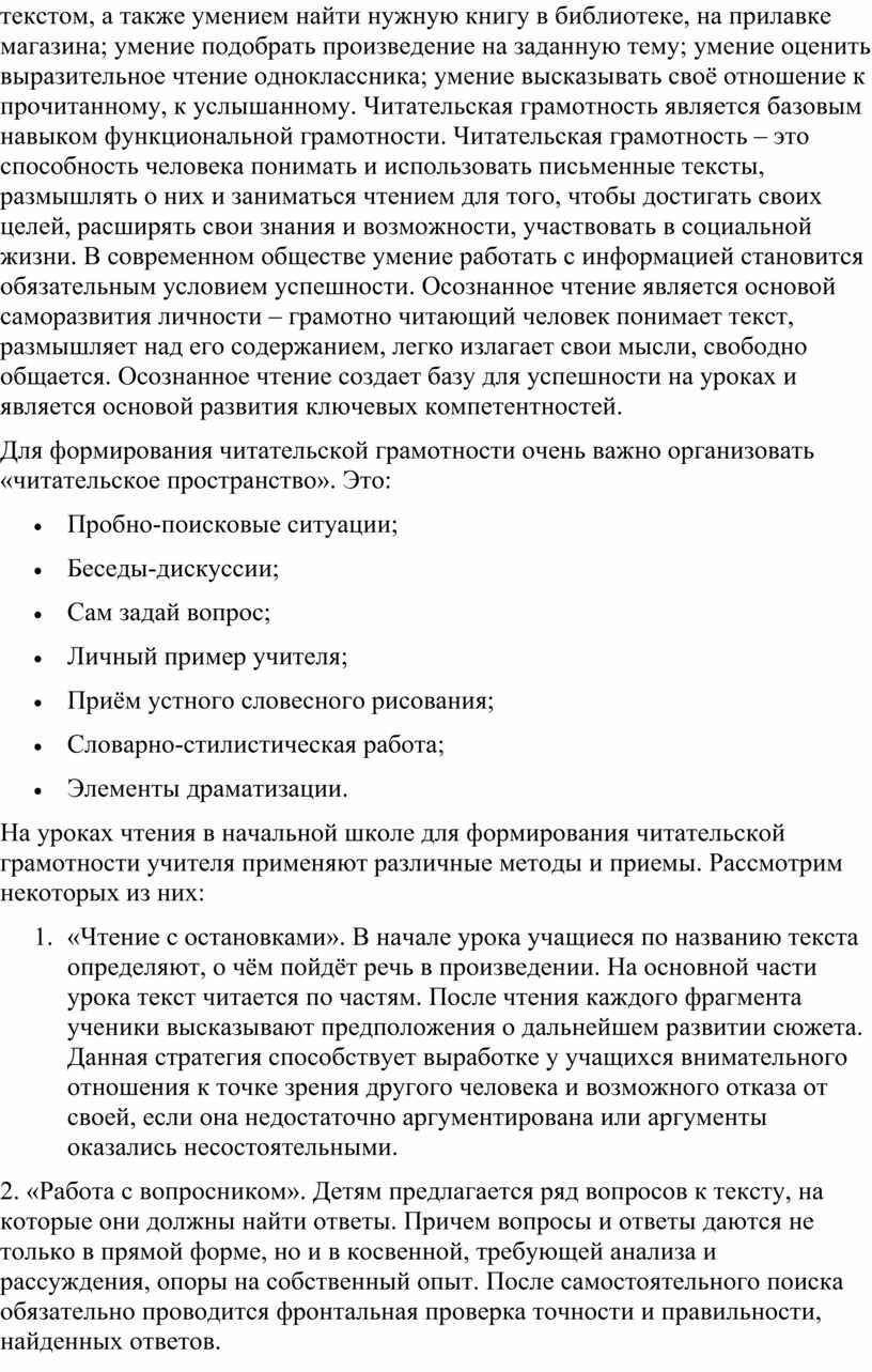 На уроках чтения в начальной школе для формирования читательской грамотности учителя применяют различные методы и приемы. Рассмотрим некоторых из них:
