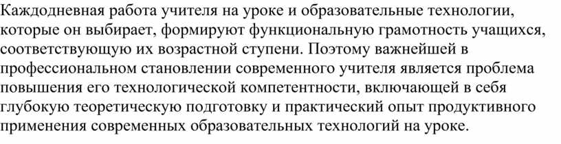 Каждодневная работа учителя на уроке и образовательные технологии, которые он выбирает, формируют функциональную грамотность учащихся, соответствующую их возрастной ступени. Поэтому важнейшей в профессиональном становлении современного учителя является проблема повышения его технологической компетентности, включающей в себя глубокую теоретическую подготовку и практический опыт продуктивного применения современных образовательных технологий на уроке.