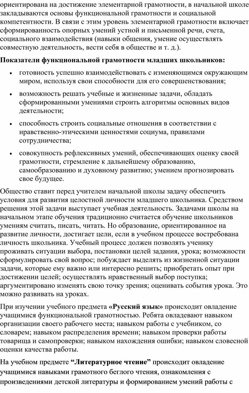 На учебном предмете “Литературное чтение” происходит овладение учащимися навыками грамотного беглого чтения, ознакомления с произведениями детской литературы и формированием умений работы с текстом, а также умением найти нужную книгу в библиотеке, на прилавке магазина; умение подобрать произведение на заданную тему; умение оценить выразительное чтение одноклассника; умение высказывать своё отношение к прочитанному, к услышанному. Читательская грамотность является базовым навыком функциональной грамотности. Читательская грамотность – это способность человека понимать и использовать письменные тексты, размышлять о них и заниматься чтением для того, чтобы достигать своих целей, расширять свои знания и возможности, участвовать в социальной жизни. В современном обществе умение работать с информацией становится обязательным условием успешности. Осознанное чтение является основой саморазвития личности – грамотно читающий человек понимает текст, размышляет над его содержанием, легко излагает свои мысли, свободно общается. Осознанное чтение создает базу для успешности на уроках и является основой развития ключевых компетентностей.