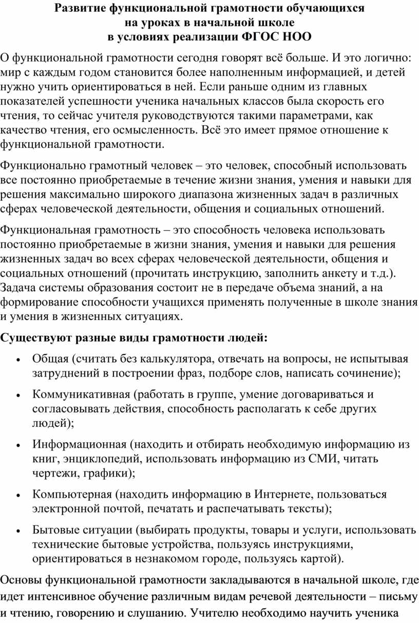 Основы функциональной грамотности закладываются в начальной школе, где идет интенсивное обучение различным видам речевой деятельности – письму и чтению, говорению и слушанию. Учителю необходимо научить ученика ориентироваться в потоке информации, обучить его способами мыслительной деятельности. Таким образом, начальная школа ориентирована на достижение элементарной грамотности, в начальной школе закладываются основы функциональной грамотности и социальной компетентности. В связи с этим уровень элементарной грамотности включает сформированность опорных умений устной и письменной речи, счета, социального взаимодействия (навыки общения, умение осуществлять совместную деятельность, вести себя в обществе и т. д.).