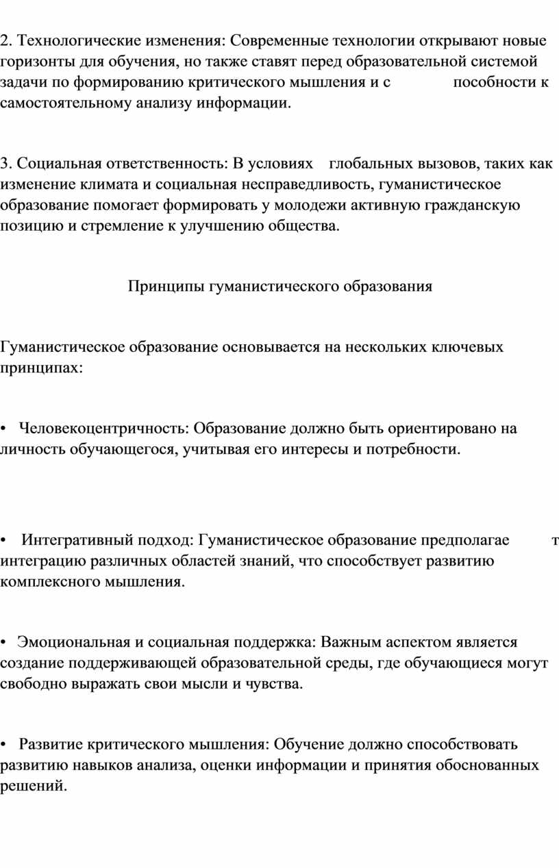 • Интегративный подход: Гуманистическое образование предполагает интеграцию различных областей знаний, что способствует развитию комплексного мышления.