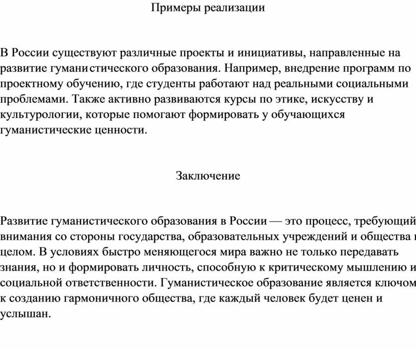 В России существуют различные проекты и инициативы, направленные на развитие гуманистического образования. Например, внедрение программ по проектному обучению, где студенты работают над реальными социальными проблемами. Также активно развиваются курсы по этике, искусству и культурологии, которые помогают формировать у обучающихся гуманистические ценности.
