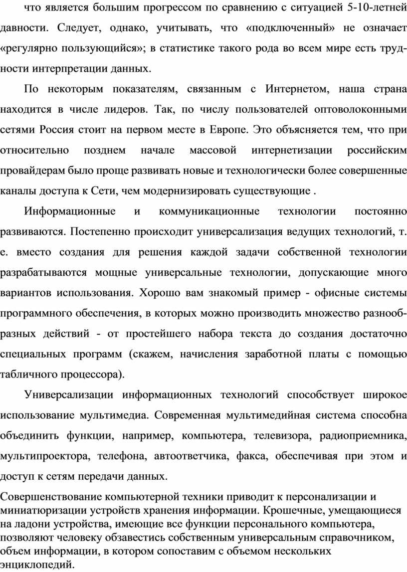 Информационные и коммуникационные технологии постоянно развиваются. Постепенно происходит универсализация ведущих технологий, т. е. вместо создания для решения каждой задачи собственной технологии разрабатываются мощные универсальные технологии, допускающие много вариантов использования. Хорошо вам знакомый пример - офисные системы программного обеспечения, в которых можно производить множество разнообразных действий - от простейшего набора текста до создания достаточно специальных программ (скажем, начисления заработной платы с помощью табличного процессора).