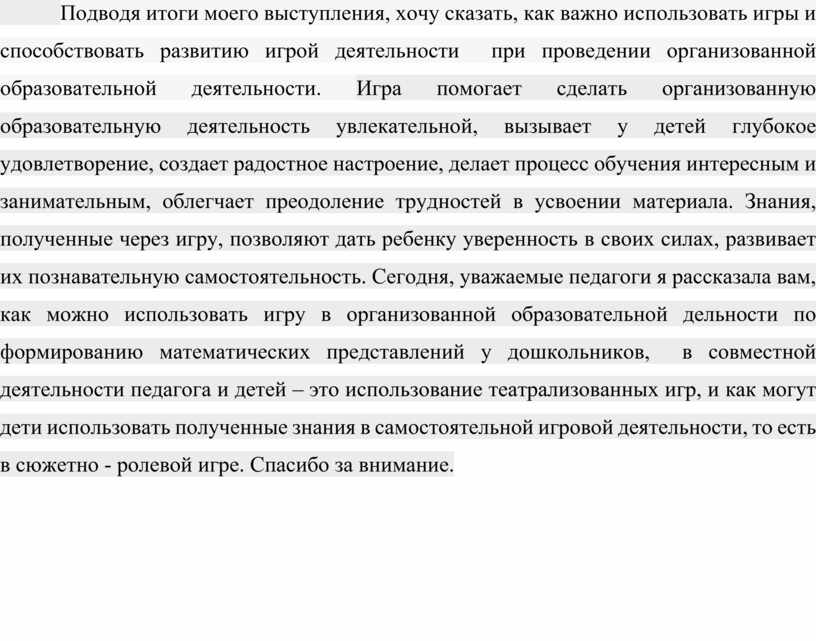 Подводя итоги моего выступления, хочу сказать, как важно использовать игры и способствовать развитию игрой деятельности при проведении организованной образовательной деятельности. Игра помогает сделать организованную образовательную деятельность увлекательной, вызывает у детей глубокое удовлетворение, создает радостное настроение, делает процесс обучения интересным и занимательным, облегчает преодоление трудностей в усвоении материала. Знания, полученные через игру, позволяют дать ребенку уверенность в своих силах, развивает их познавательную самостоятельность. Сегодня, уважаемые педагоги я рассказала вам, как можно использовать игру в организованной образовательной дельности по формированию математических представлений у дошкольников, в совместной деятельности педагога и детей – это использование театрализованных игр, и как могут дети использовать полученные знания в самостоятельной игровой деятельности, то есть в сюжетно - ролевой игре. Спасибо за внимание.