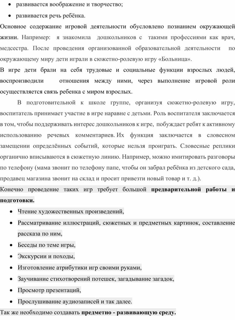 Основное содержание игровой деятельности обусловлено познанием окружающей жизни. Например: я знакомила дошкольников с такими профессиями как врач, медсестра. После проведения организованной образовательной деятельности по окружающему миру дети играли в сюжетно-ролевую игру «Больница».