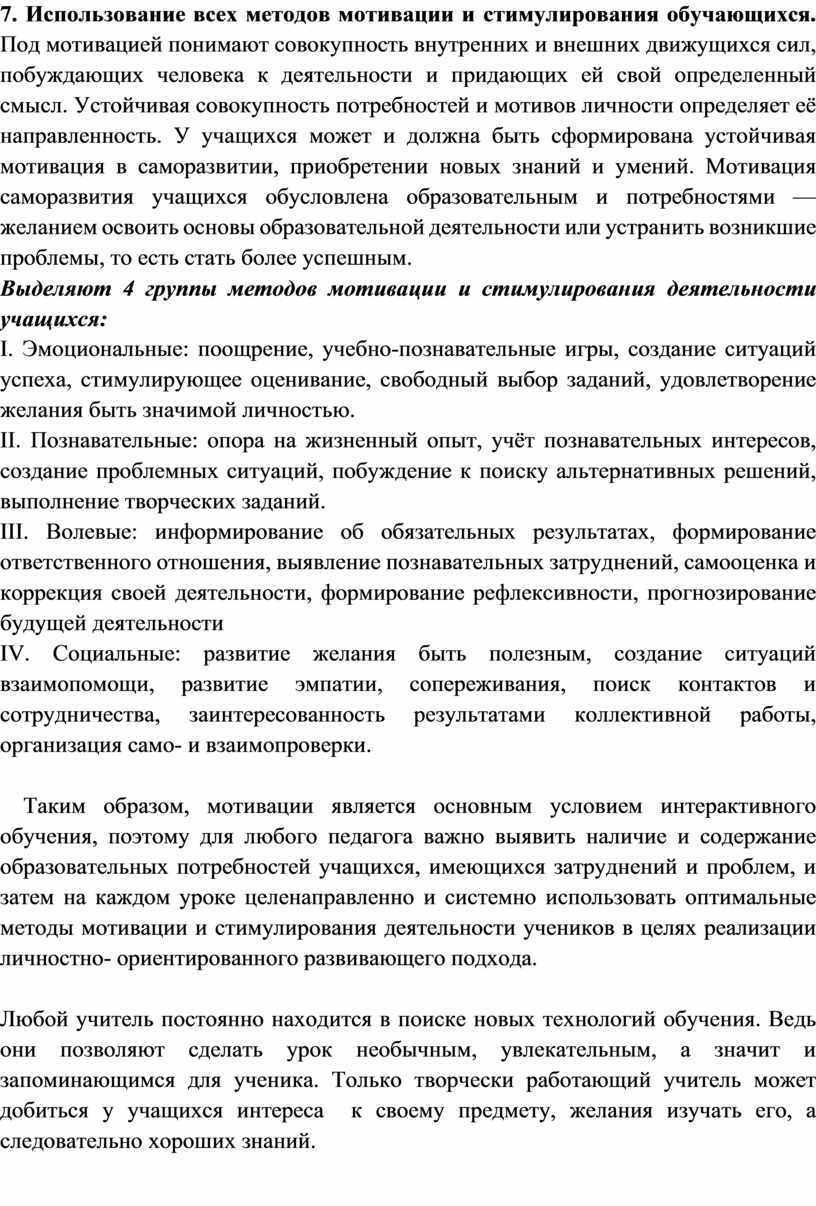 7. Использование всех методов мотивации и стимулирования обучающихся. Под мотивацией понимают совокупность внутренних и внешних движущихся сил, побуждающих человека к деятельности и придающих ей свой определенный смысл. Устойчивая совокупность потребностей и мотивов личности определяет её направленность. У учащихся может и должна быть сформирована устойчивая мотивация в саморазвитии, приобретении новых знаний и умений. Мотивация саморазвития учащихся обусловлена образовательным и потребностями — желанием освоить основы образовательной деятельности или устранить возникшие проблемы, то есть стать более успешным.