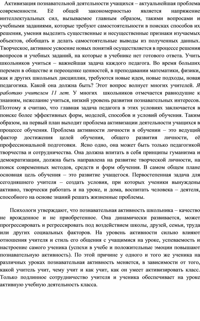 Активизация познавательной деятельности учащихся – актуальнейшая проблема современности. Её общей закономерностью является напряжение интеллектуальных сил, вызываемое главным образом, такими вопросами и учебными заданиями, которые требуют самостоятельности в поисках способов их решения, умения выделить существенные и несущественные признаки изучаемых объектов, обобщать и делать самостоятельные выводы из полученных данных. Творческое, активное усвоение новых понятий осуществляется в процессе решения вопросов и учебных заданий, на которые в учебнике нет готового ответа. Учить школьников учиться – важнейшая задача каждого педагога. Во время больших перемен в обществе и переоценке ценностей, в преподавании математики, физики, как и других школьных дисциплин, требуются новые идеи, новые подходы, новая педагогика. Какой она должна быть? Этот вопрос волнует многих учителей. Я работаю учителем 11 лет. У многих школьников отмечается равнодушие к знаниям, нежелание учиться, низкий уровень развития познавательных интересов. Поэтому я считаю, что главная задача педагога в этих условиях заключается в поиске более эффективных форм, моделей, способов и условий обучения. Таким образом, на первый план выходит проблема активизации деятельности учащихся в процессе обучения. Проблема активности личности в обучении – это ведущий фактор достижения целей обучения, общего развития личности, её профессиональной подготовки. Ясно одно, она может быть только педагогикой творчества и сотрудничества. Она должна впитать в себя принципы гуманизма и демократизации, должна быть направлена на развитие творческой личности, на поиск современных методов, средств и форм обучения. В самом общем плане основная цель обучения – это развитие учащегося. Первостепенная задача для сегодняшнего учителя – создать условия, при которых ученики вынуждены активно, творчески работать и на уроке, и дома, воспитать человека – деятеля, способного на основе знаний решать жизненные проблемы.