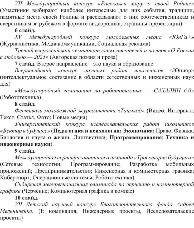Университетский конкурс исследовательских работ школьников «Вектор в будущее» (Педагогика и психология; Экономика; Право; Физика; Биология и наука о жизни; Лингвистика; Программирование; Техника и инженерные науки)
