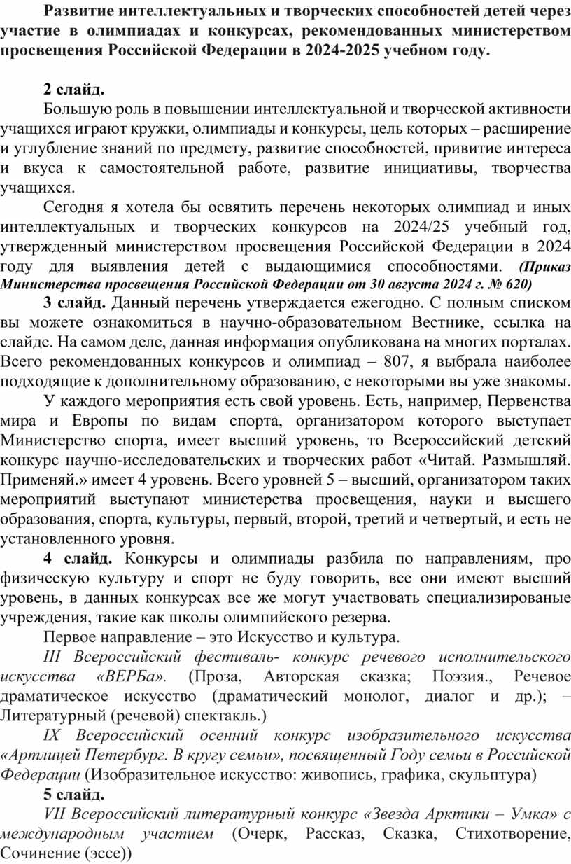 Сегодня я хотела бы освятить перечень некоторых олимпиад и иных интеллектуальных и творческих конкурсов на 2024/25 учебный год, утвержденный министерством просвещения Российской Федерации в 2024 году для выявления детей с выдающимися способностями. (Приказ Министерства просвещения Российской Федерации от 30 августа 2024 г. № 620)