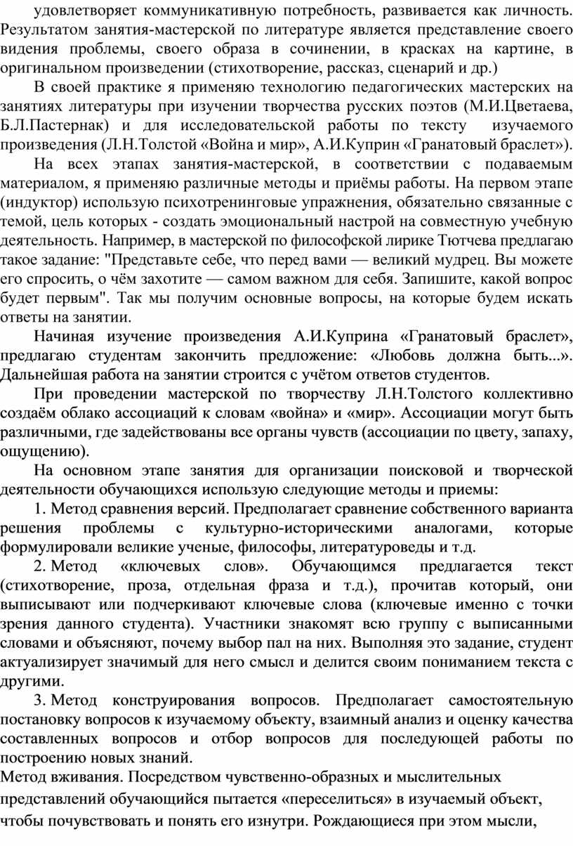 В своей практике я применяю технологию педагогических мастерских на занятиях литературы при изучении творчества русских поэтов (М.И.Цветаева, Б.Л.Пастернак) и для исследовательской работы по тексту изучаемого произведения (Л.Н.Толстой «Война и мир», А.И.Куприн «Гранатовый браслет»).