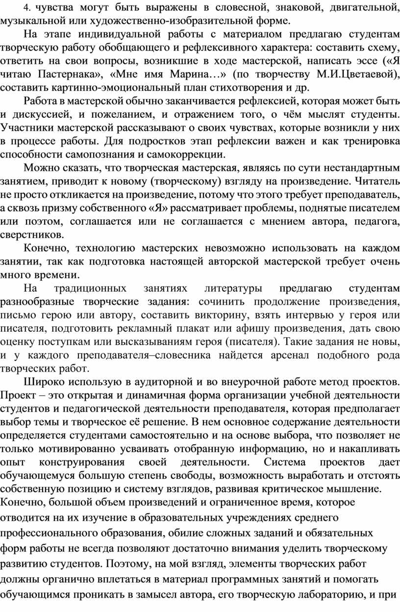 Одним из компонентов системы работы по развитию творческих способностей студентов являются занятия литературы, построенные на основе технологии педагогических мастерских. Мастерская - это нестандартная форма организации учебного процесса, которая помогает создать творческую атмосферу, психологический комфорт, способствует развитию креативных умнений, познавательных и коммуникативных способностей обучающихся, позволяет осуществить и эмоционально прочувствовать процесс совместного творчества (сотворчества), поиска знания.