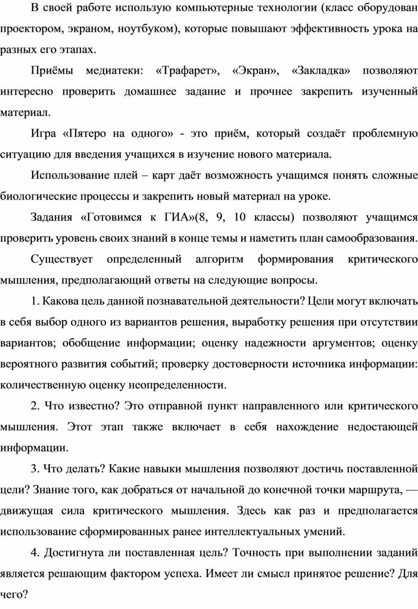 РАЗВИТИЕ КРИТИЧЕСКОГО МЫШЛЕНИЯ И АКТИВИЗАЦИЯ ПОЗНАВАТЕЛЬНОЙ ДЕЯТЕЛЬНОСТИ ОБУЧАЮЩИХСЯ НА УРОКАХ БИОЛОГИИ (из опыта работы)