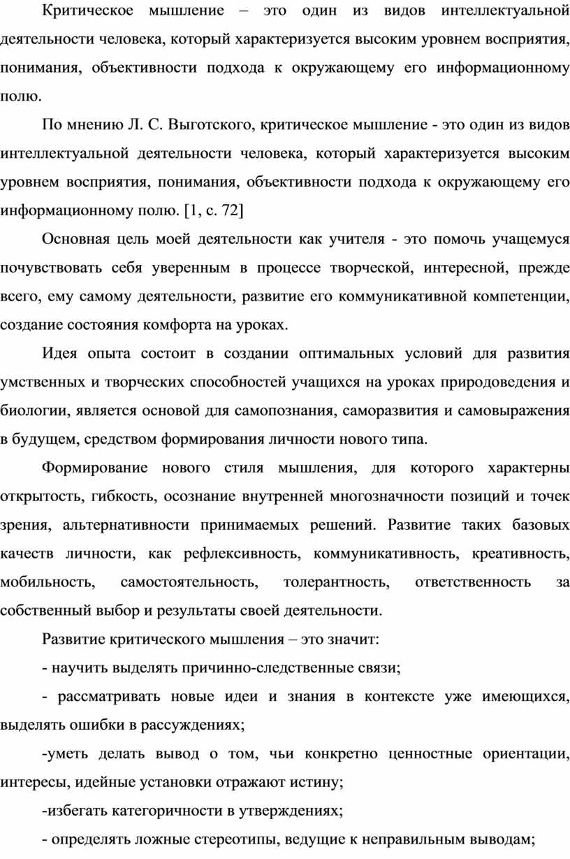 По мнению Л. С. Выготского, критическое мышление - это один из видов интеллектуальной деятельности человека, который характеризуется высоким уровнем восприятия, понимания, объективности подхода к окружающему его информационному полю. [1, с. 72]