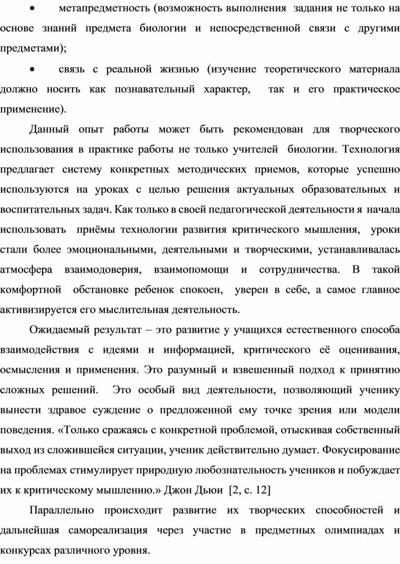 Ожидаемый результат – это развитие у учащихся естественного способа взаимодействия с идеями и информацией, критического её оценивания, осмысления и применения. Это разумный и взвешенный подход к принятию сложных решений. Это особый вид деятельности, позволяющий ученику вынести здравое суждение о предложенной ему точке зрения или модели поведения. «Только сражаясь с конкретной проблемой, отыскивая собственный выход из сложившейся ситуации, ученик действительно думает. Фокусирование на проблемах стимулирует природную любознательность учеников и побуждает их к критическому мышлению.» Джон Дьюи [2, с. 12]