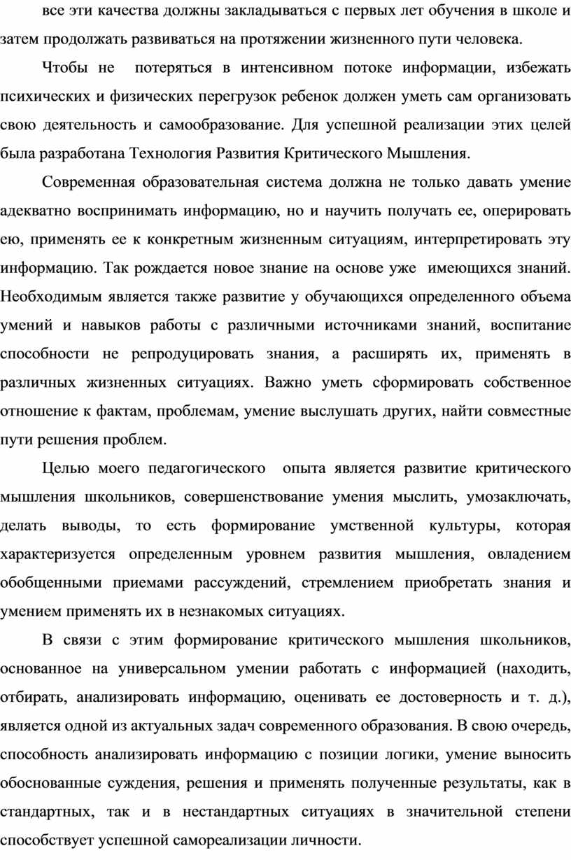 Аннотация. В данной статье описывается опыт учителя, который использует технологии критического мышления для формирования грамотной, творческой, заинтересованной личности.