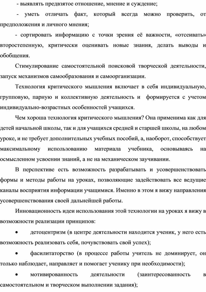 Технология критического мышления включает в себя индивидуальную, групповую, парную и коллективную деятельность и формируется с учетом индивидуально-возрастных особенностей учащихся.