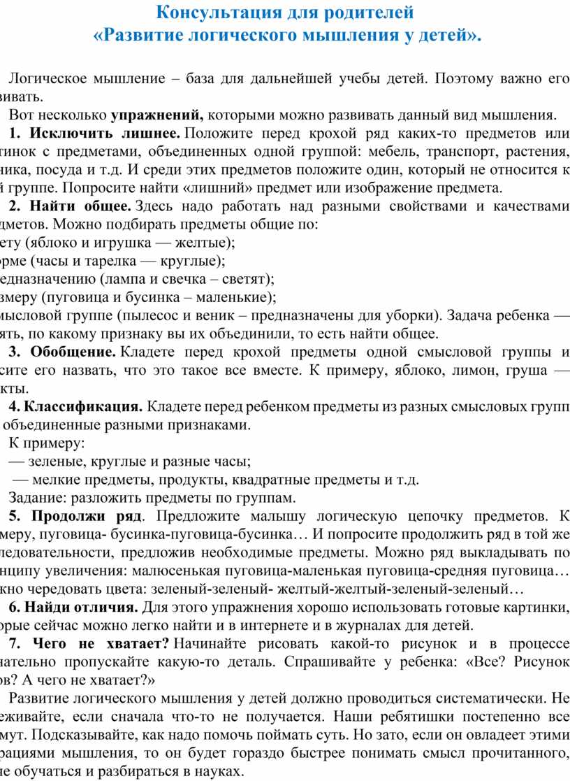 Развитие логического мышления у детей должно проводиться систематически. Не переживайте, если сначала что-то не получается. Наши ребятишки постепенно все поймут. Подсказывайте, как надо помочь поймать суть. Но зато, если он овладеет этими операциями мышления, то он будет гораздо быстрее понимать смысл прочитанного, легче обучаться и разбираться в науках.