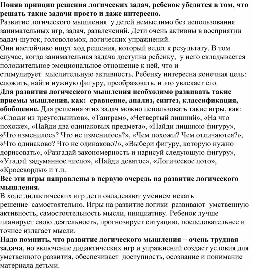 Для развития логического мышления необходимо развивать такие приемы мышления, как: сравнение, анализ, синтез, классификация, обобщение. Для решения этих задач можно использовать такие игры, как: «Сложи из треугольников», «Танграм», «Четвертый лишний», «На что похоже», «Найди два одинаковых предмета», «Найди лишнюю фигуру», «Что изменилось? Что не изменилось?», «Чем похожи? Чем отличаются?», «Что одинаково? Что не одинаково?», «Выбери фигуру, которую нужно дорисовать», «Разгадай закономерность и нарисуй следующую фигуру», «Угадай задуманное число», «Найди девятое», «Логическое лото», «Кроссворды» и т.п.