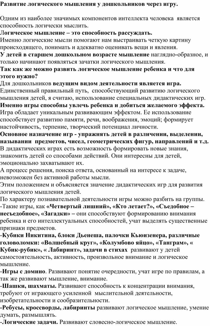 Развитие логического мышления у дошкольников через игру.