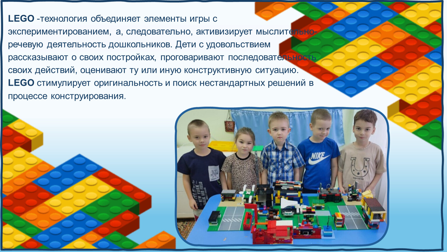 LEGO -технология объединяет элементы игры с экспериментированием, а, следовательно, активизирует мыслительно-речевую деятельность дошкольников. Дети с удовольствием рассказывают о своих постройках, проговаривают последовательность своих действий, оценивают ту или иную конструктивную ситуацию. LEGO стимулирует оригинальность и поиск нестандартных решений в процессе конструирования.