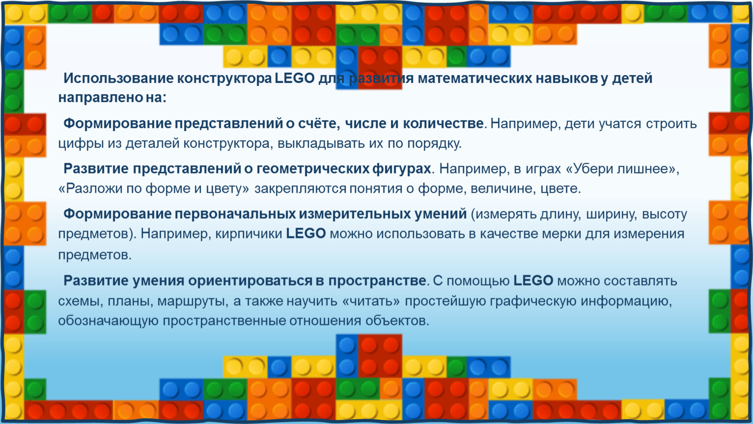 Конструктор LEGO является очень подходящим материалом для целей математического развития, будучи образным для ребенка, доступным для его тактильного восприятия, вмещающим в себя огромный мир математических задач.