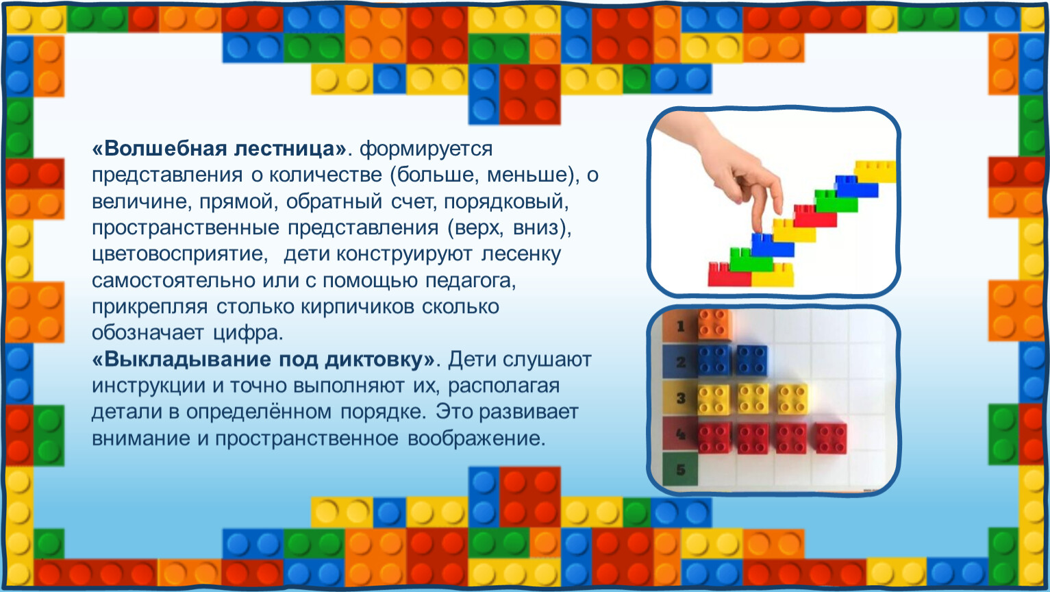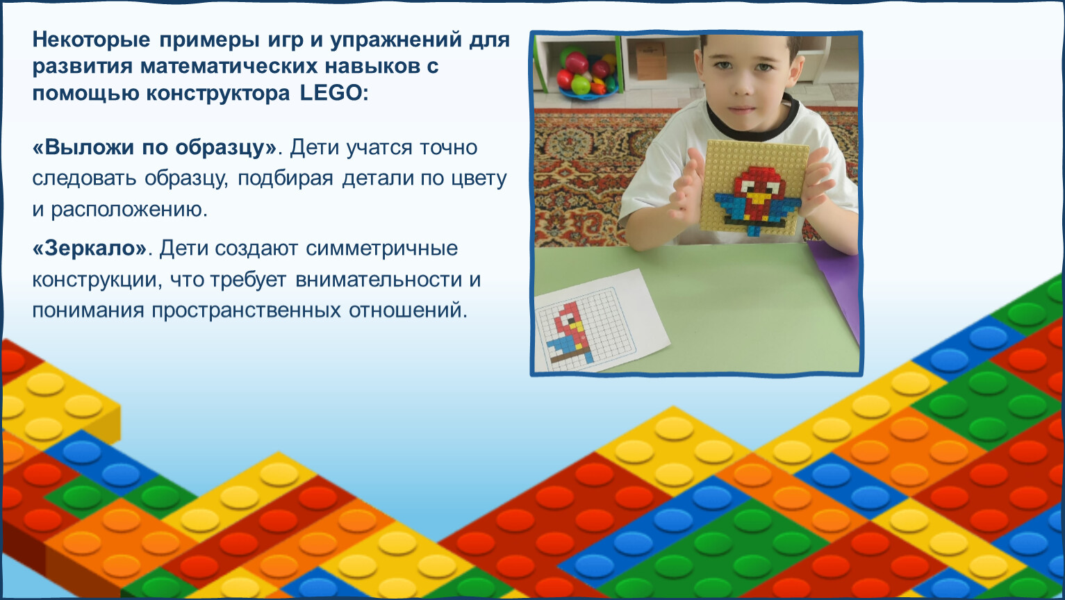 Некоторые примеры игр и упражнений для развития математических навыков с помощью конструктора LEGO: