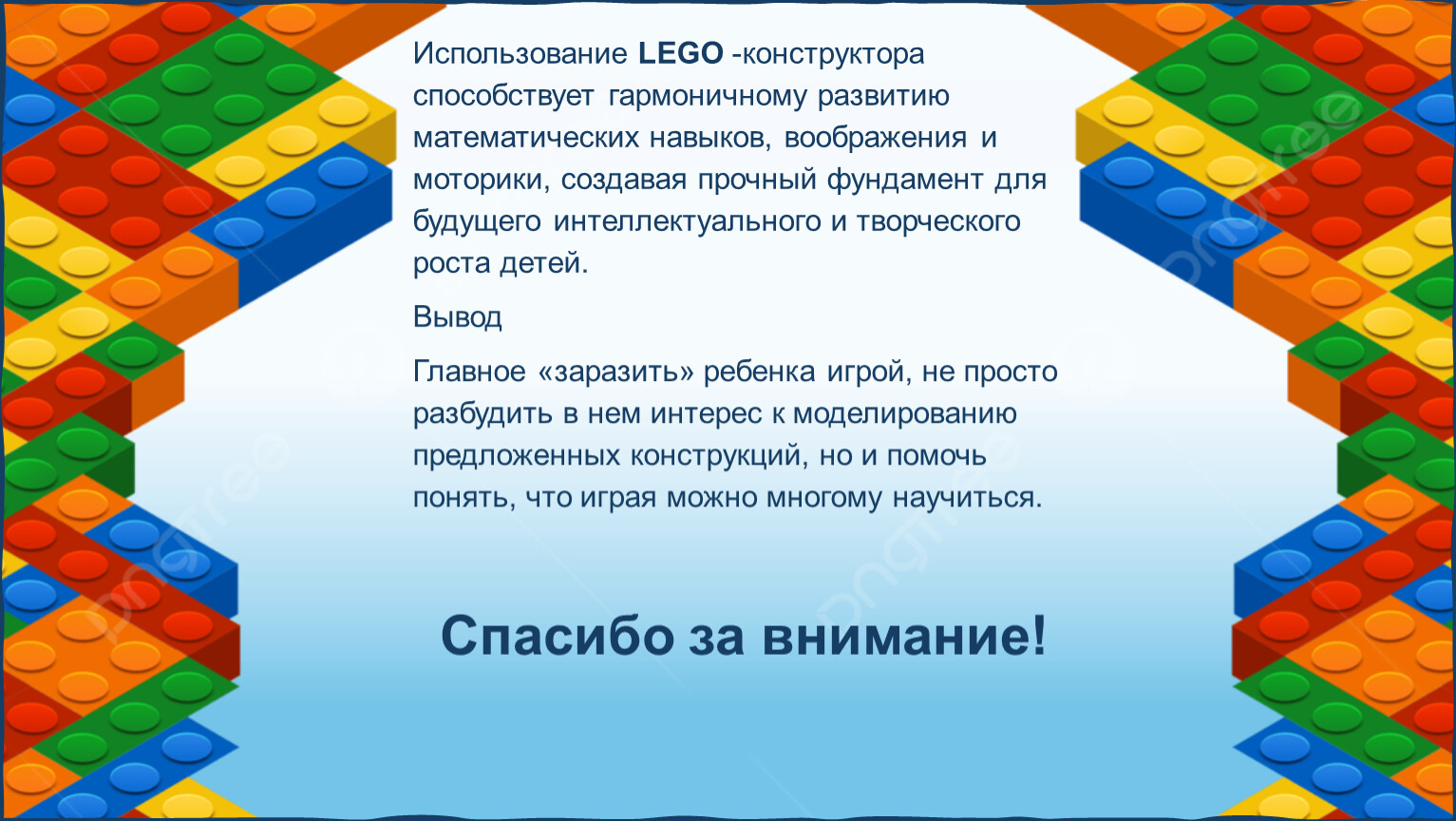 Использование LEGO -конструктора способствует гармоничному развитию математических навыков, воображения и моторики, создавая прочный фундамент для будущего интеллектуального и творческого роста детей.