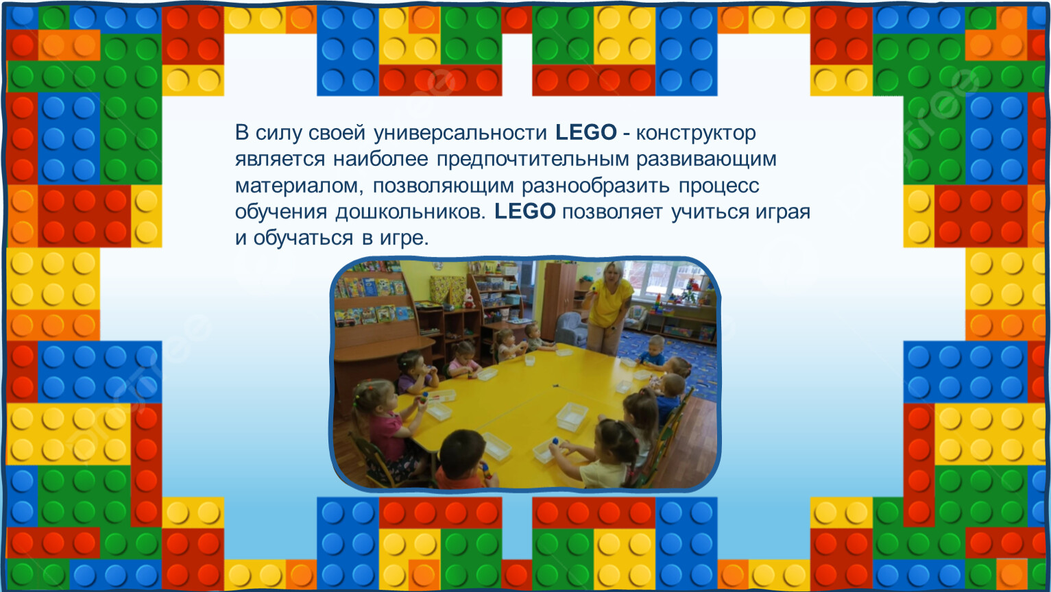 В силу своей универсальности LEGO - конструктор является наиболее предпочтительным развивающим материалом, позволяющим разнообразить процесс обучения дошкольников. LEGO позволяет учиться играя и обучаться в игре.
