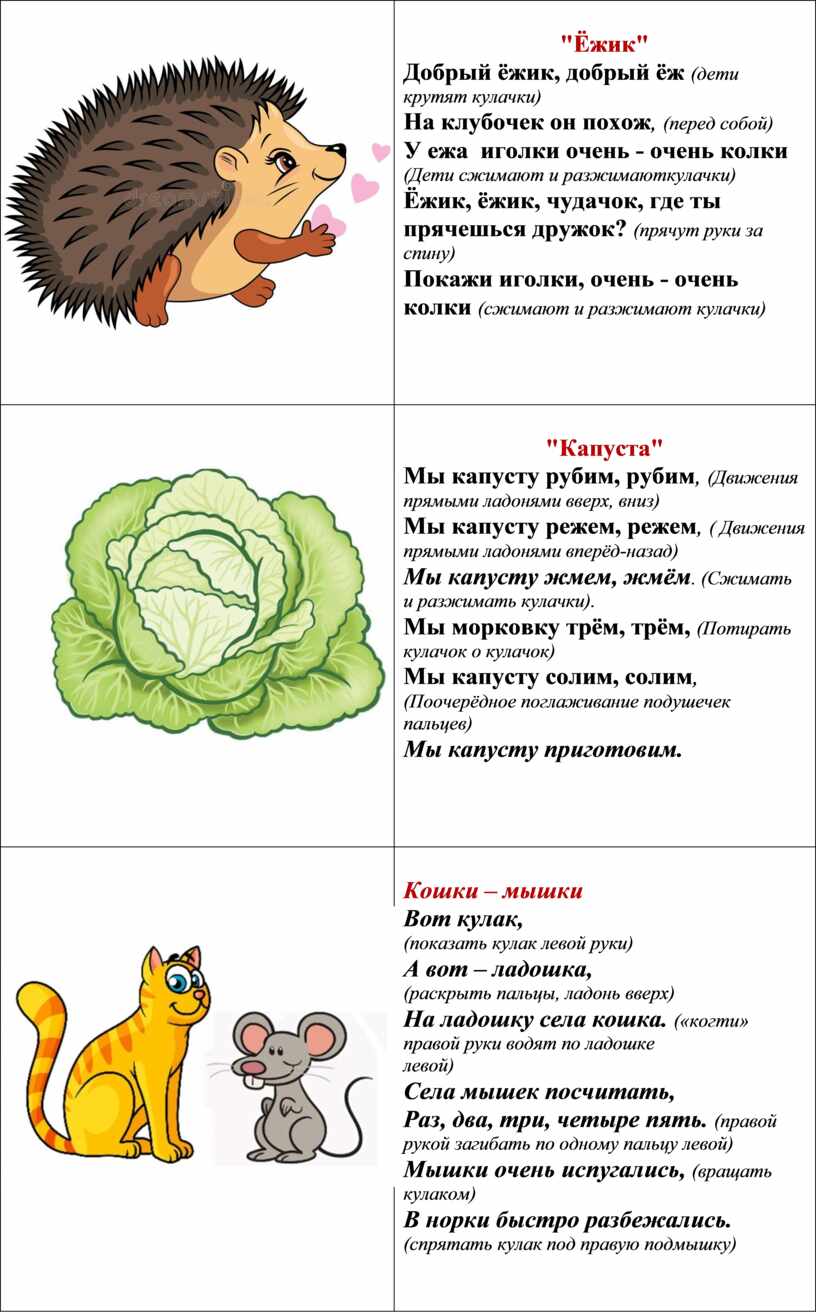 "Капуста" Мы капусту рубим, рубим, (Движения прямыми ладонями вверх, вниз) Мы капусту режем, режем, ( Движения прямыми ладонями вперёд-назад) Мы капусту жмем, жмём. (Сжимать и разжимать кулачки). Мы морковку трём, трём, (Потирать кулачок о кулачок) Мы капусту солим, солим, (Поочерёдное поглаживание подушечек пальцев) Мы капусту приготовим.