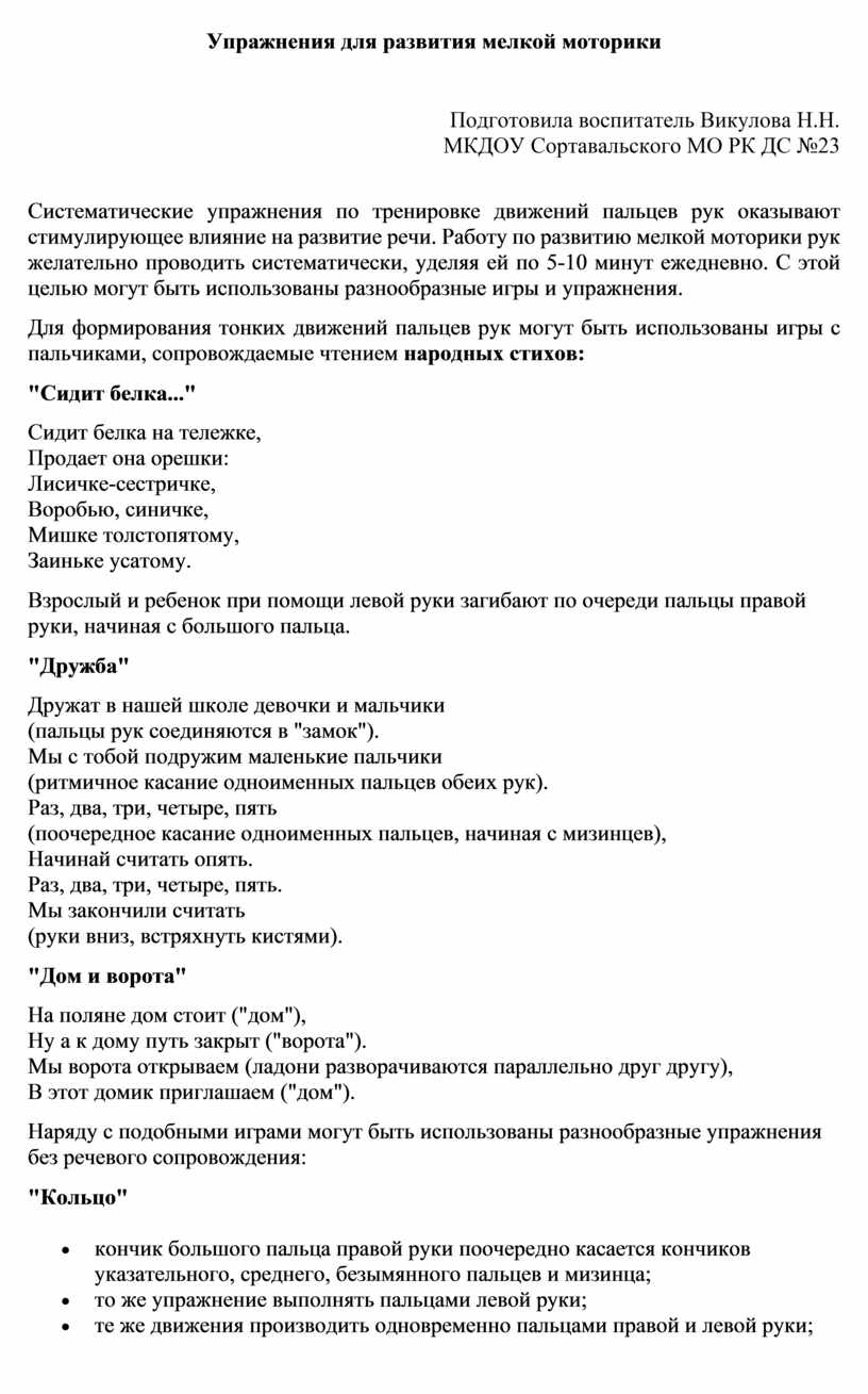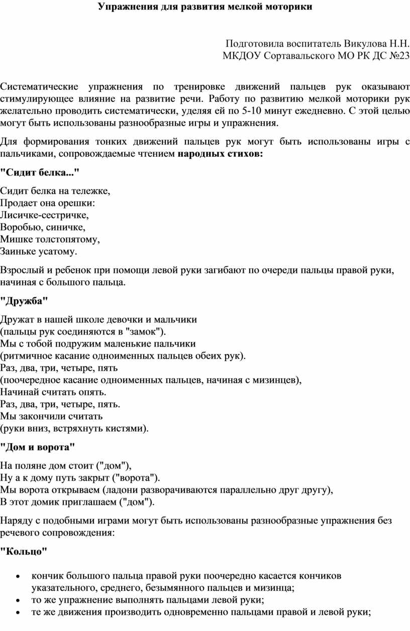 Систематические упражнения по тренировке движений пальцев рук оказывают стимулирующее влияние на развитие речи. Работу по развитию мелкой моторики рук желательно проводить систематически, уделяя ей по 5-10 минут ежедневно. С этой целью могут быть использованы разнообразные игры и упражнения. Для формирования тонких движений пальцев рук могут быть использованы игры с пальчиками, сопровождаемые чтением народных стихов: "Сидит белка..." Сидит