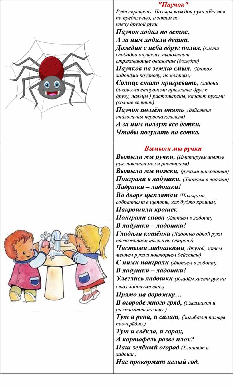 "Паучок" Руки скрещены. Пальцы каждой руки «Бегут» по предплечью, а затем по плечу другой руки. Паучок ходил по ветке, А за ним ходили детки. Дождик с неба вдруг полил, (кисти свободно опущены, выполняют стряхивающее движение (дождик) Паучков на землю смыл. (Хлопок ладонями по столу, по коленям) Солнце стало пригревать, (ладони боковыми сторонами прижаты друг к другу, пальцы ) растопырены, качают руками (солнце светит) Паучок ползёт опять ,(действия аналогичны первоначальным) А за ним ползут все детки, Чтобы погулять по ветке.