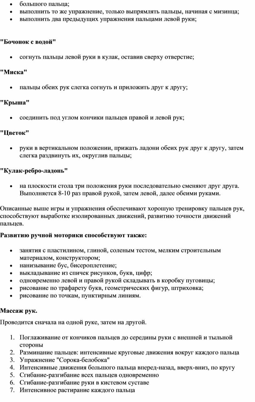 Описанные выше игры и упражнения обеспечивают хорошую тренировку пальцев рук, способствуют выработке изолированных движений, развитию точности движений пальцев. Развитию ручной моторики способствуют также: