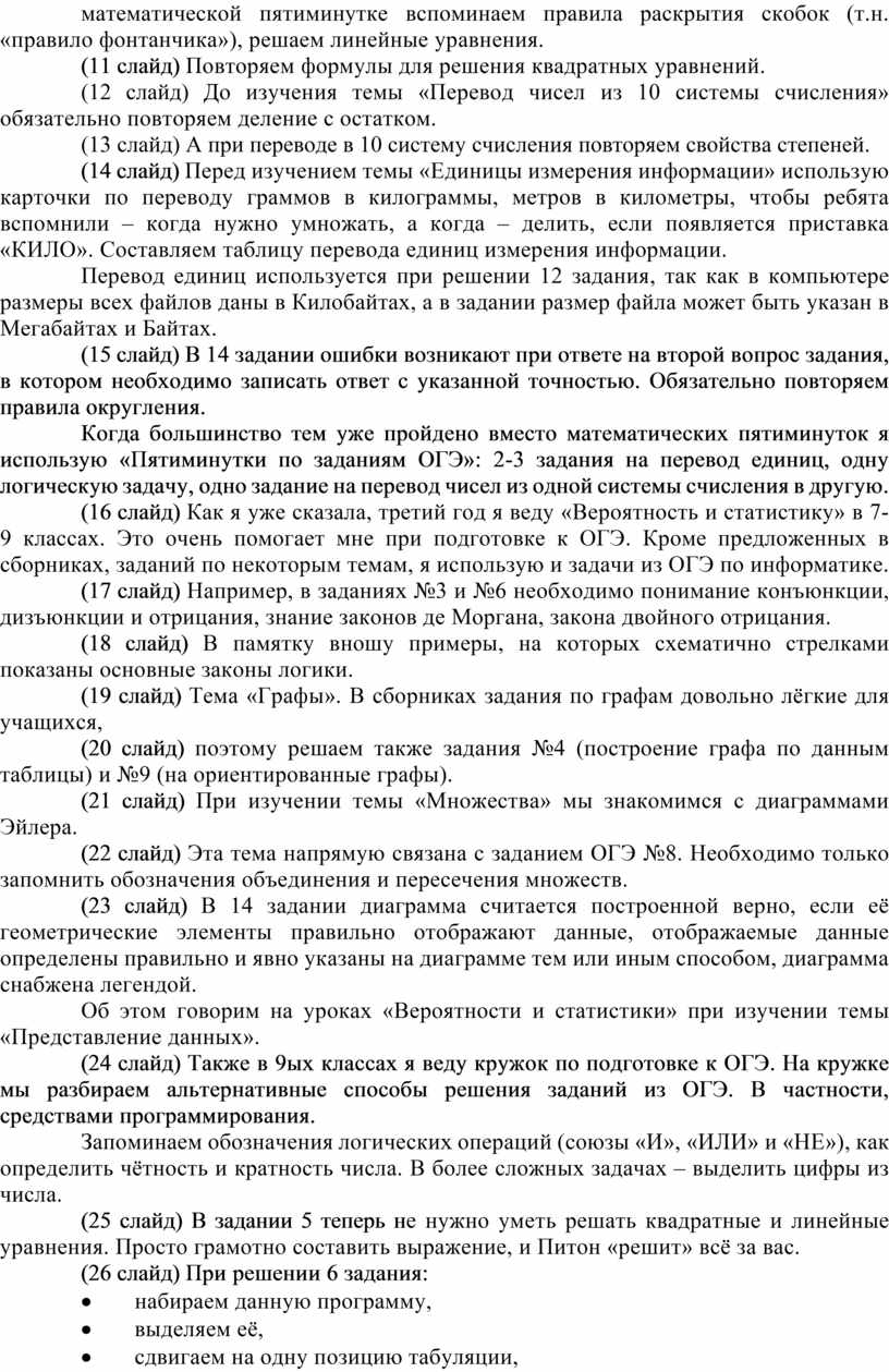 (24 слайд) Также в 9ых классах я веду кружок по подготовке к ОГЭ. На кружке мы разбираем альтернативные способы решения заданий из ОГЭ. В частности, средствами программирования.