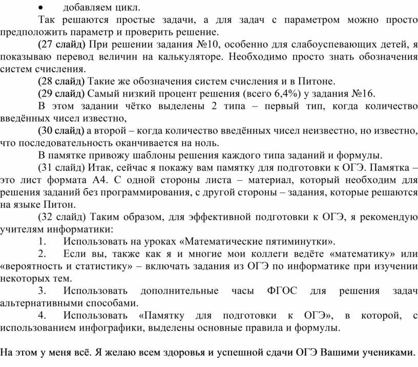 (32 слайд) Таким образом, для эффективной подготовки к ОГЭ, я рекомендую учителям информатики: