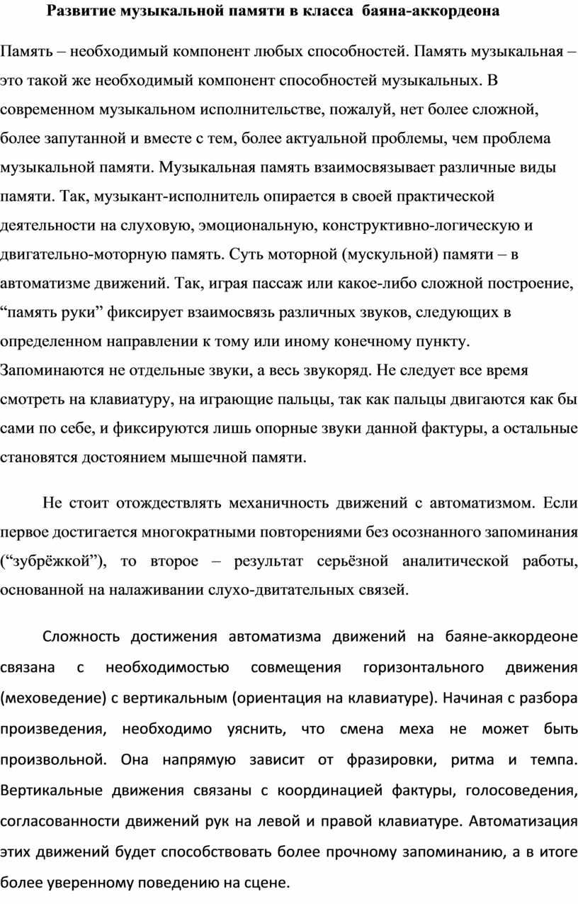 Развитие музыкальной памяти в класса баяна-аккордеона