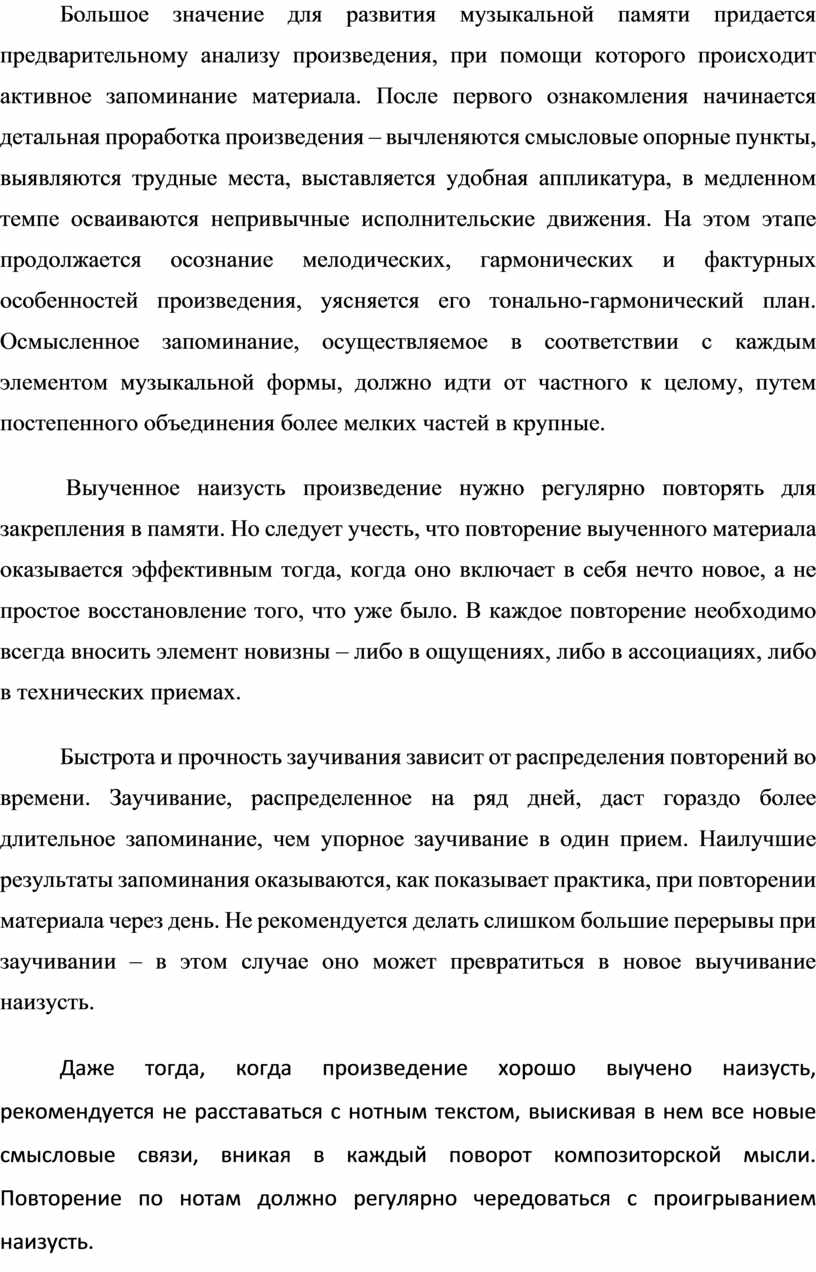 Большое значение для развития музыкальной памяти придается предварительному анализу произведения, при помощи которого происходит активное запоминание материала. После первого ознакомления начинается детальная проработка произведения – вычленяются смысловые опорные пункты, выявляются трудные места, выставляется удобная аппликатура, в медленном темпе осваиваются непривычные исполнительские движения. На этом этапе продолжается осознание мелодических, гармонических и фактурных особенностей произведения, уясняется его тонально-гармонический план. Осмысленное запоминание, осуществляемое в соответствии с каждым элементом музыкальной формы, должно идти от частного к целому, путем постепенного объединения более мелких частей в крупные.