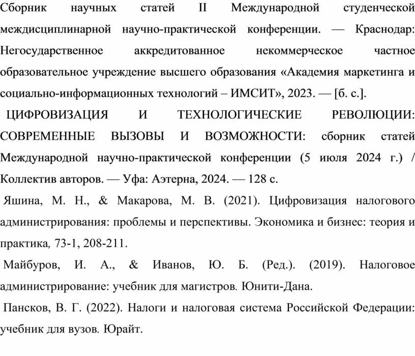 8. Сборник научных статей II Международной студенческой междисциплинарной научно-практической конференции. — Краснодар: Негосударственное аккредитованное некоммерческое частное образовательное учреждение высшего образования «Академия маркетинга и социально-информационных технологий – ИМСИТ», 2023. — [б. с.].