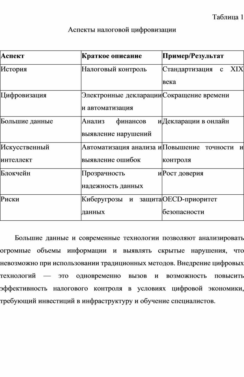 Большие данные и современные технологии позволяют анализировать огромные объемы информации и выявлять скрытые нарушения, что невозможно при использовании традиционных методов. Внедрение цифровых технологий — это одновременно вызов и возможность повысить эффективность налогового контроля в условиях цифровой экономики, требующий инвестиций в инфраструктуру и обучение специалистов.