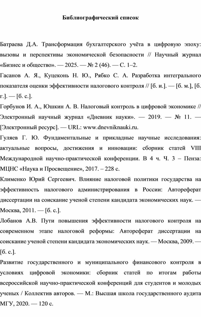 1. Батраева Д.А. Трансформация бухгалтерского учёта в цифровую эпоху: вызовы и перспективы экономической безопасности // Научный журнал «Бизнес и общество». — 2025. — № 2 (46). — С. 1–2.