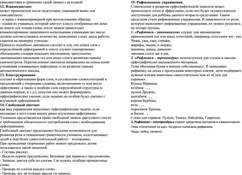 может проводиться после подготовки, описанной выше для самодиктанта: Ценность подобных диктантов состоит в том, что поиск слов с определённой орфограммой в тексте служит одновременно обогащению словаря младших школьников, зрительному запоминанию написания тех или иных слов и развитию навыка самоконтроля. Перечисленные диктанты направлены на осмысление учениками усваиваемых орфограмм, и на развитие навыка автоматического письма. 13. Конструирование состоит в образовании форм слов, в составлении словосочетаний и предложений с опорными словами, включающими ту или иную орфограмму, а также в подборе слов определённой структуры (с данным корнем, и т.д.), попутно оно может формировать орфографические умения, если задание на подбор будет связано с изучаемой орфограммой. 14. Свободный диктант