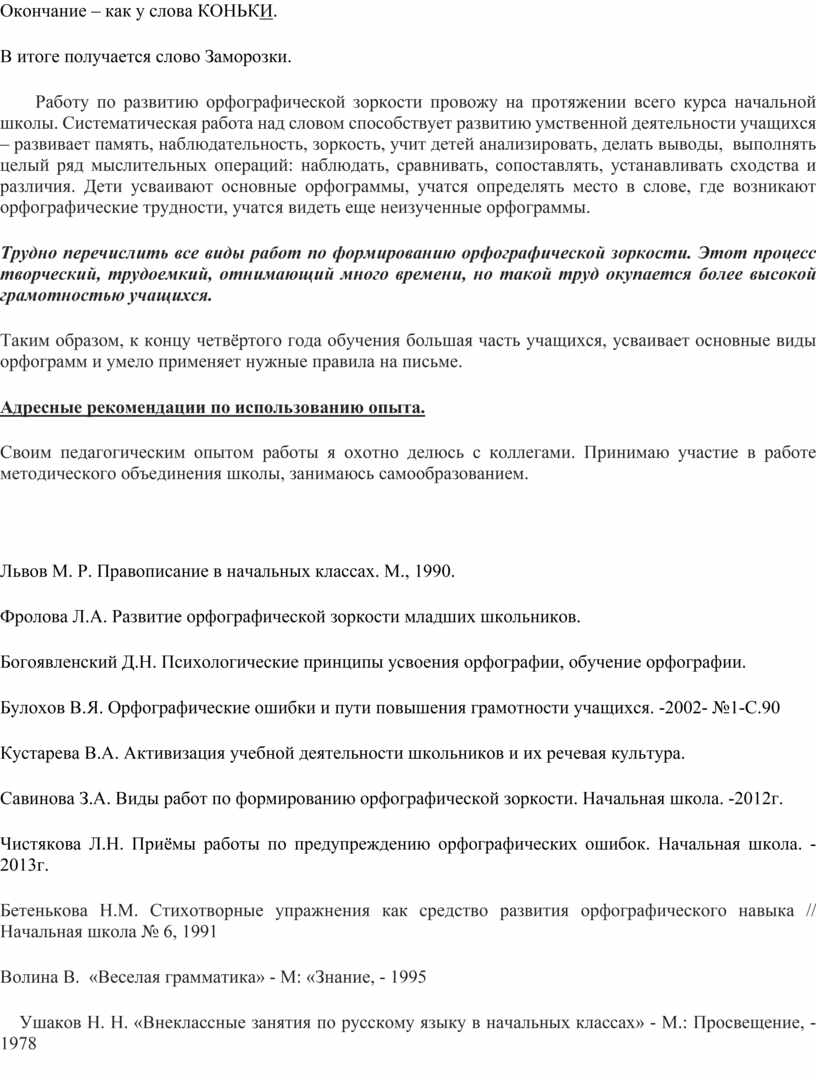 Трудно перечислить все виды работ по формированию орфографической зоркости. Этот процесс творческий, трудоемкий, отнимающий много времени, но такой труд окупается более высокой грамотностью учащихся.
