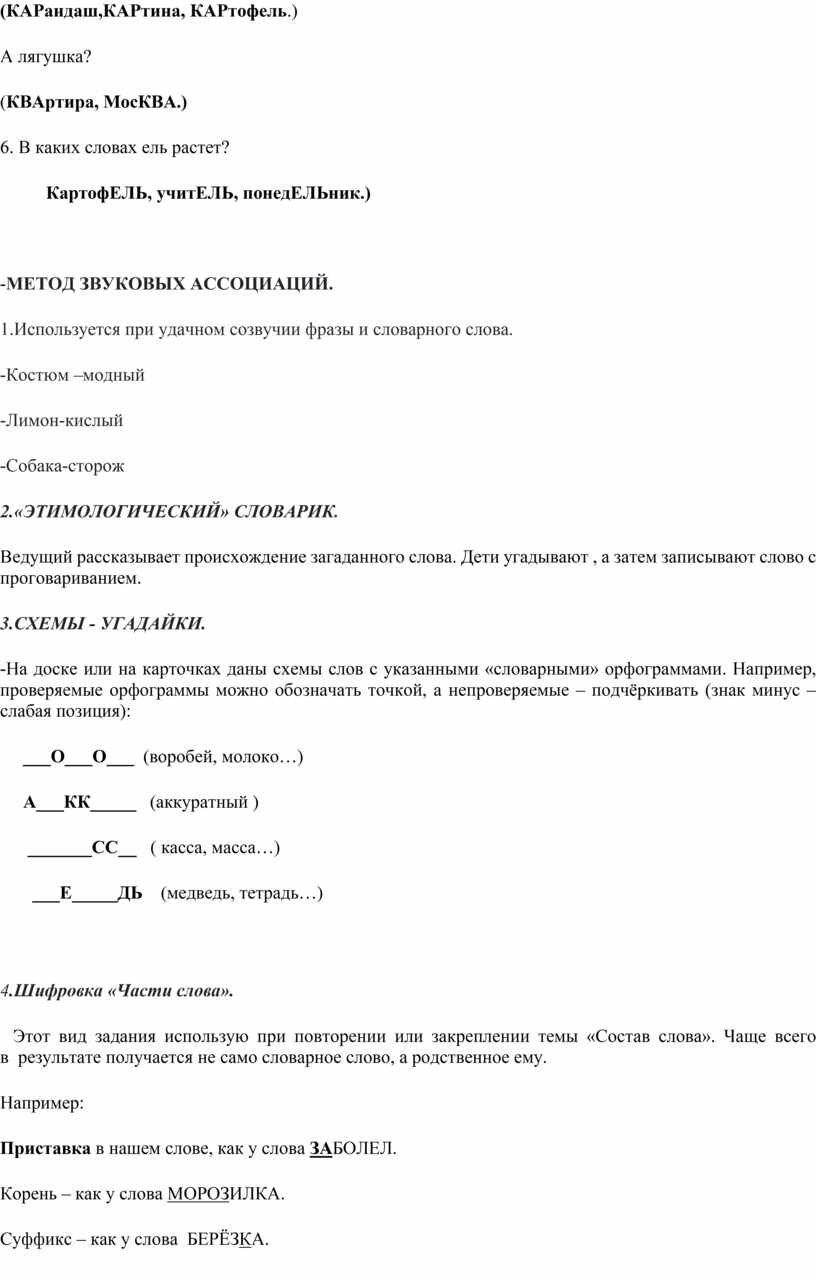 -На доске или на карточках даны схемы слов с указанными «словарными» орфограммами. Например, проверяемые орфограммы можно обозначать точкой, а непроверяемые – подчёркивать (знак минус – слабая позиция):
